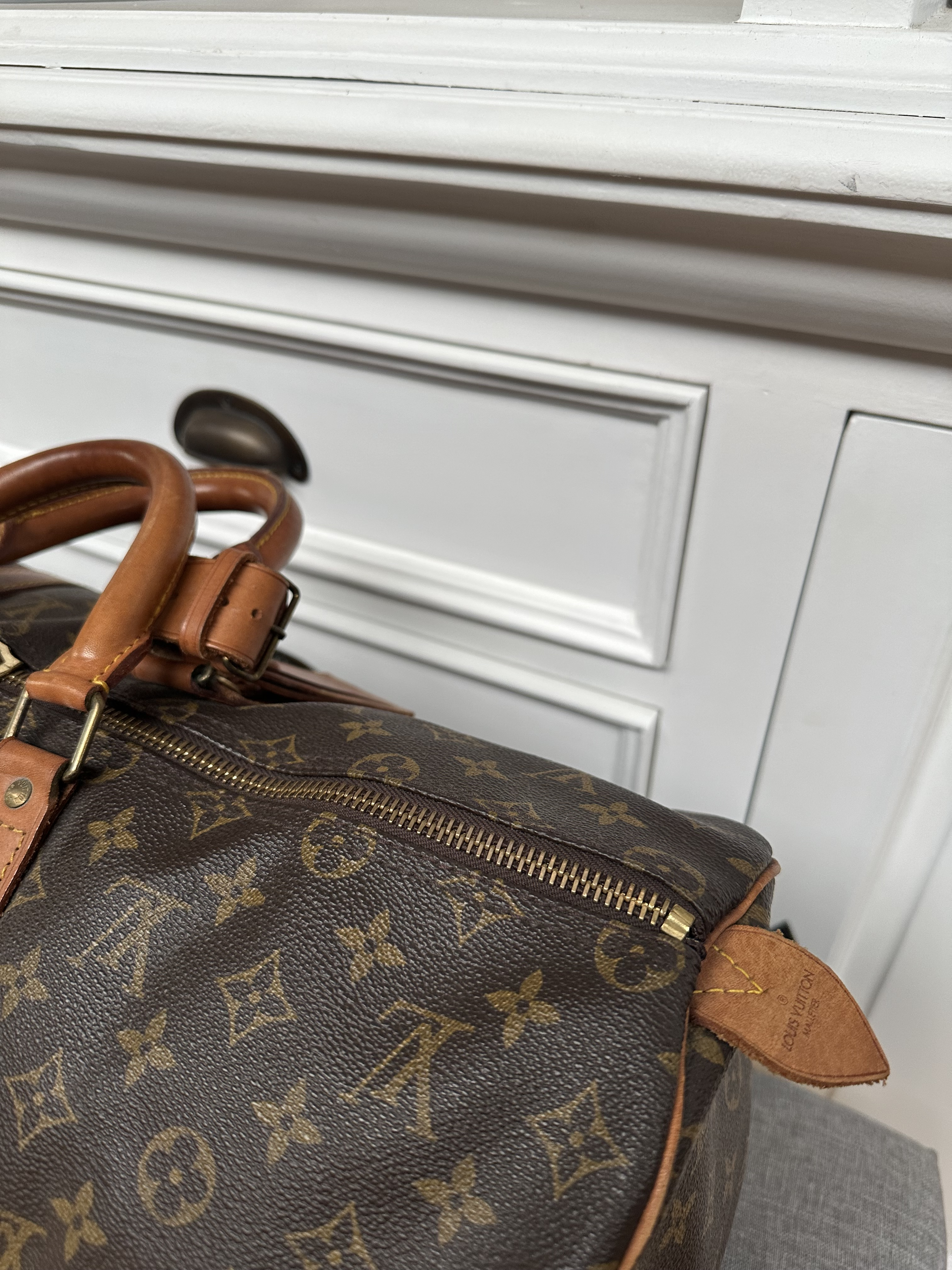Bankje met violet-taupe kleurige gecapituleerde stoffen bekleding eveneens te koop voor €275