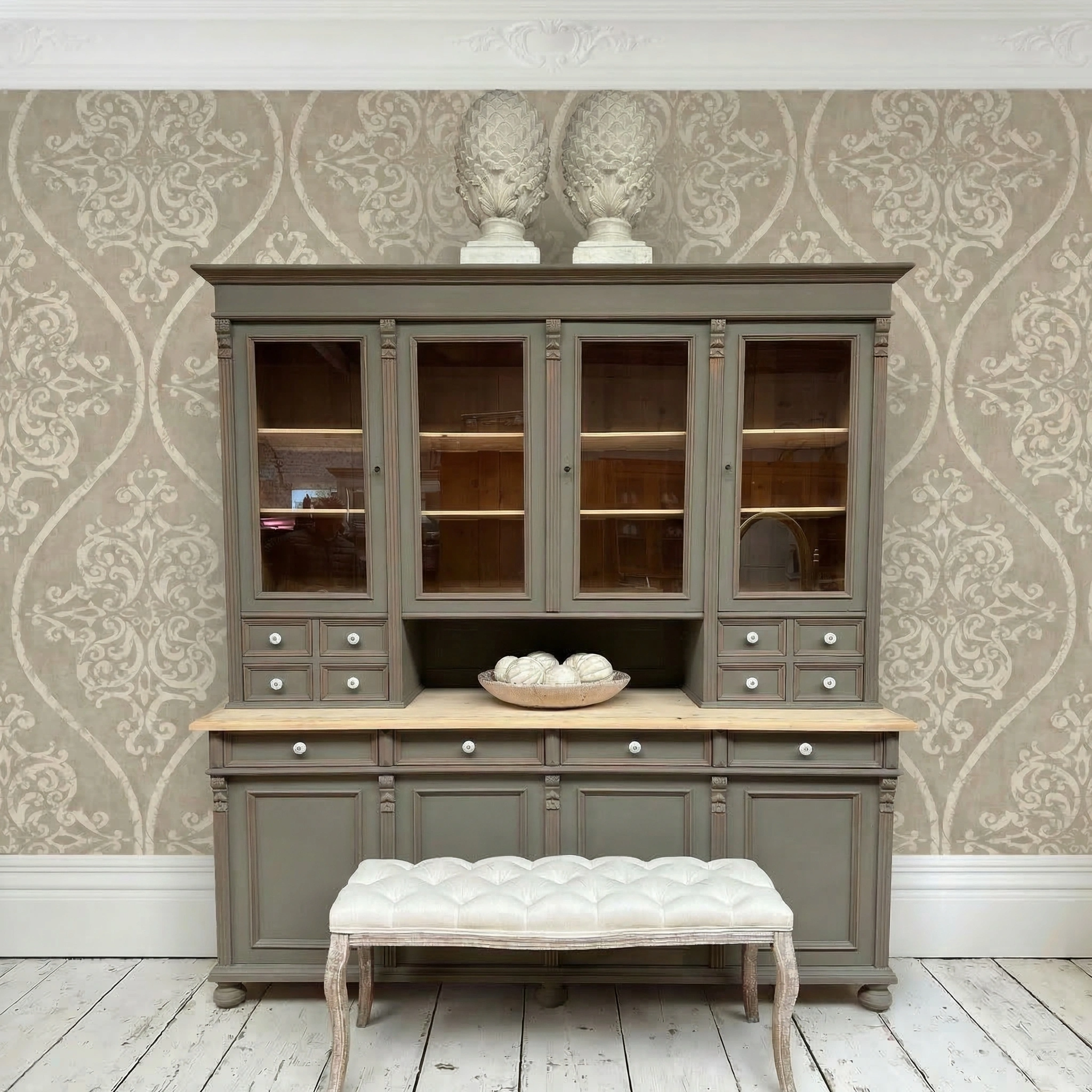 Bankje met ecru-kleurige gecapituleerde stoffen bekleding eveneens te koop voor €250