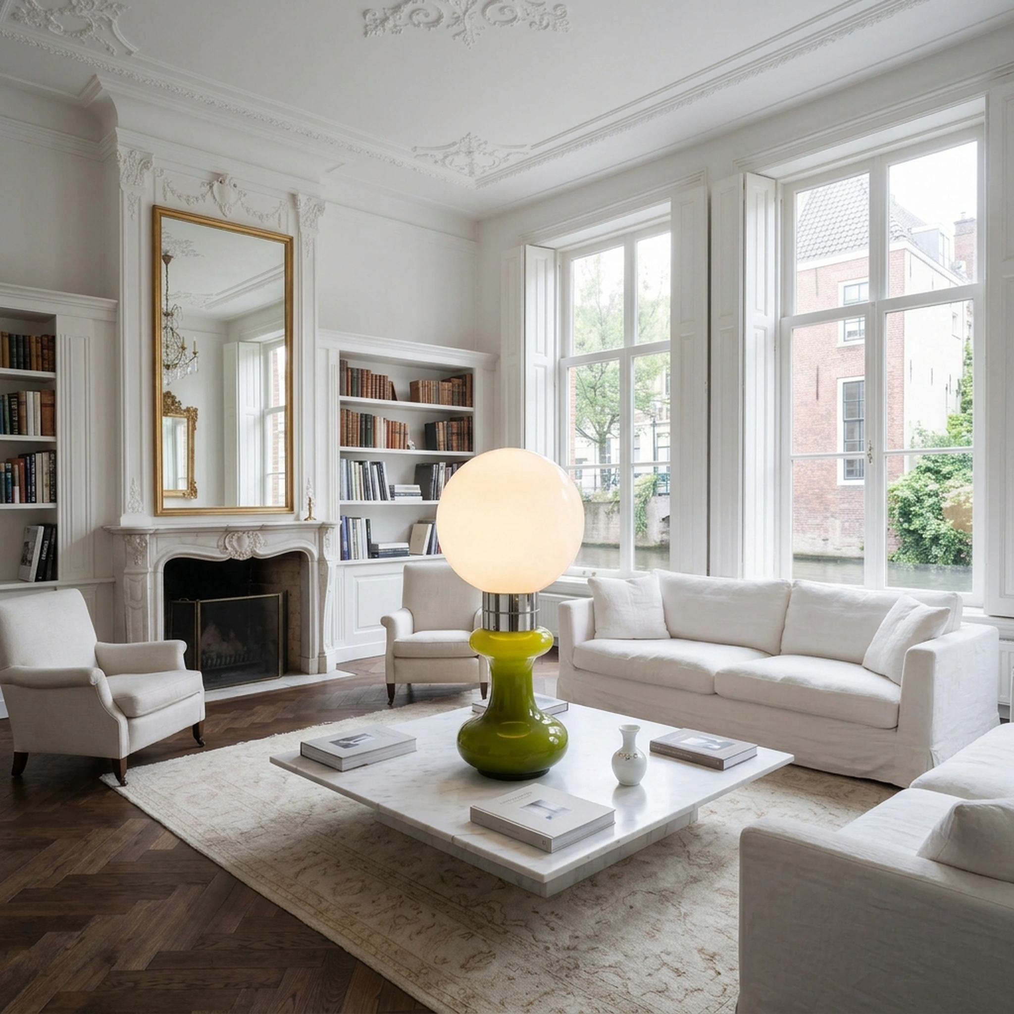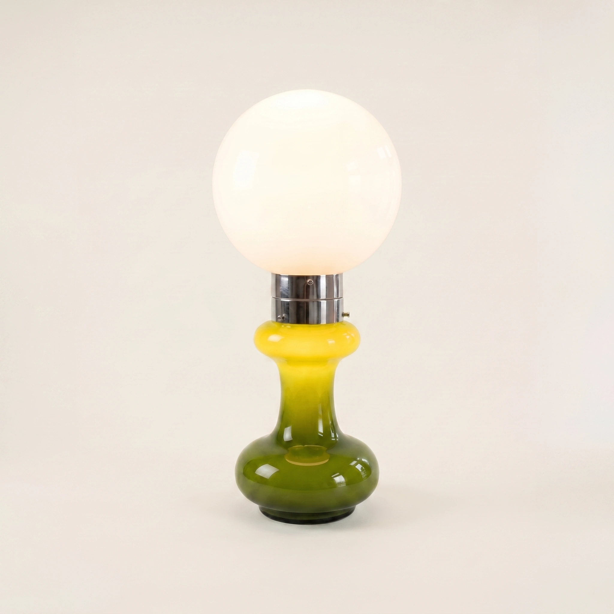 Modern designobject. Lichtpunten zowel in de witte bol als in de groene voet.
