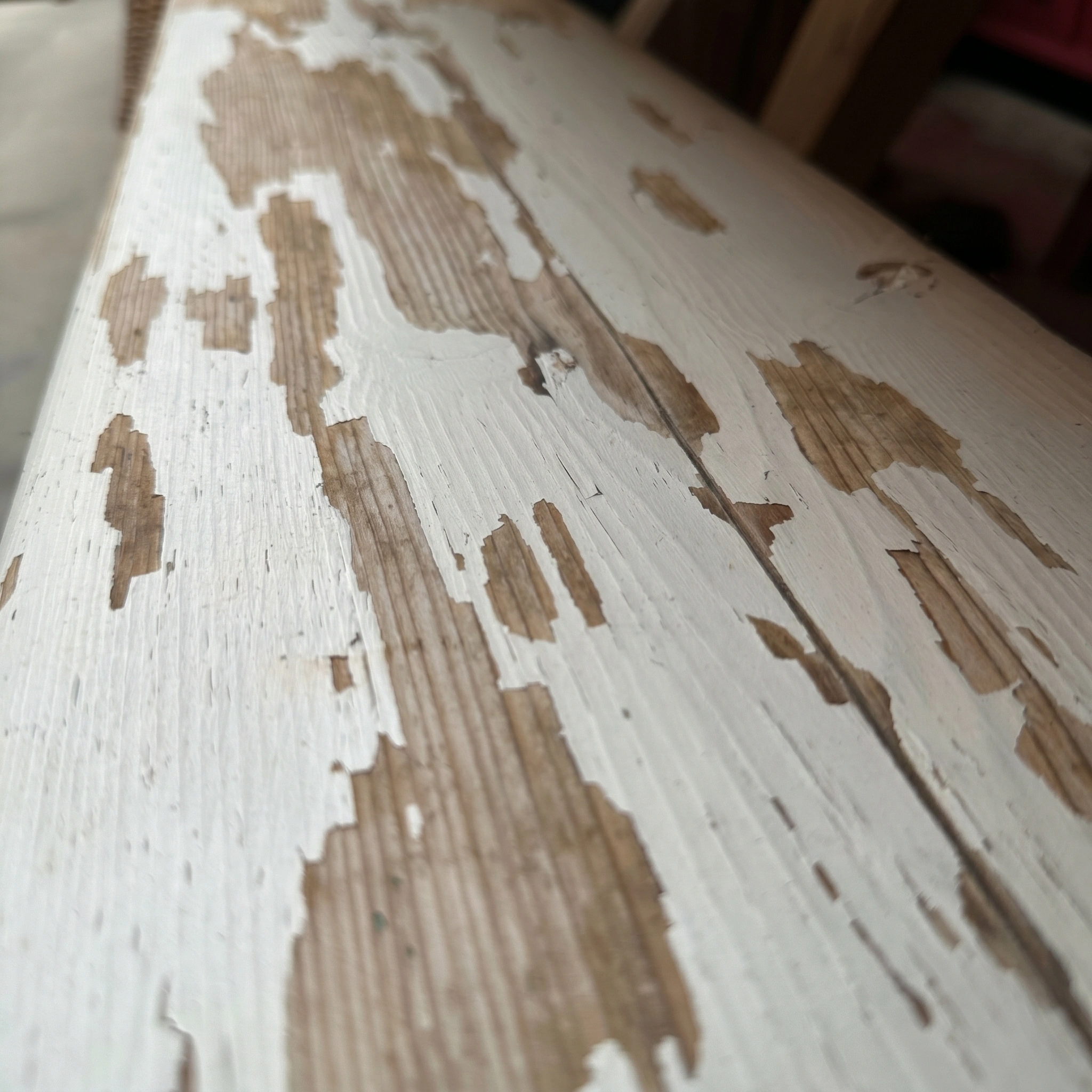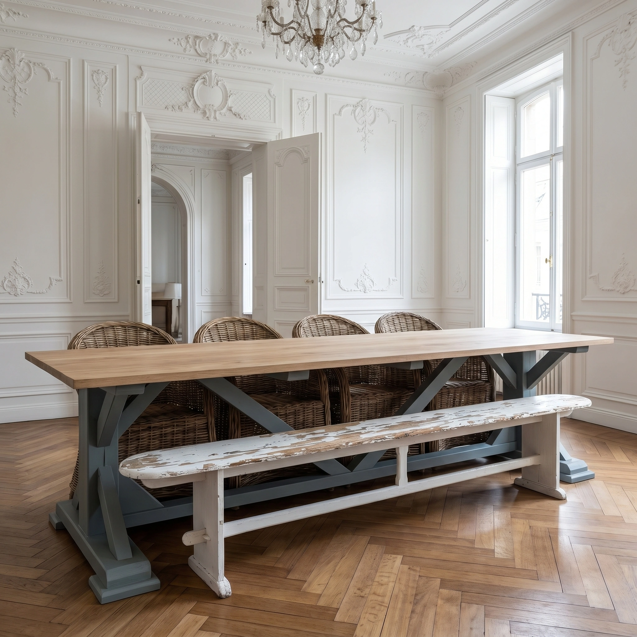 Taupekleurige kloostertafel met naturel eiken blad eveneens te koop voor €2350