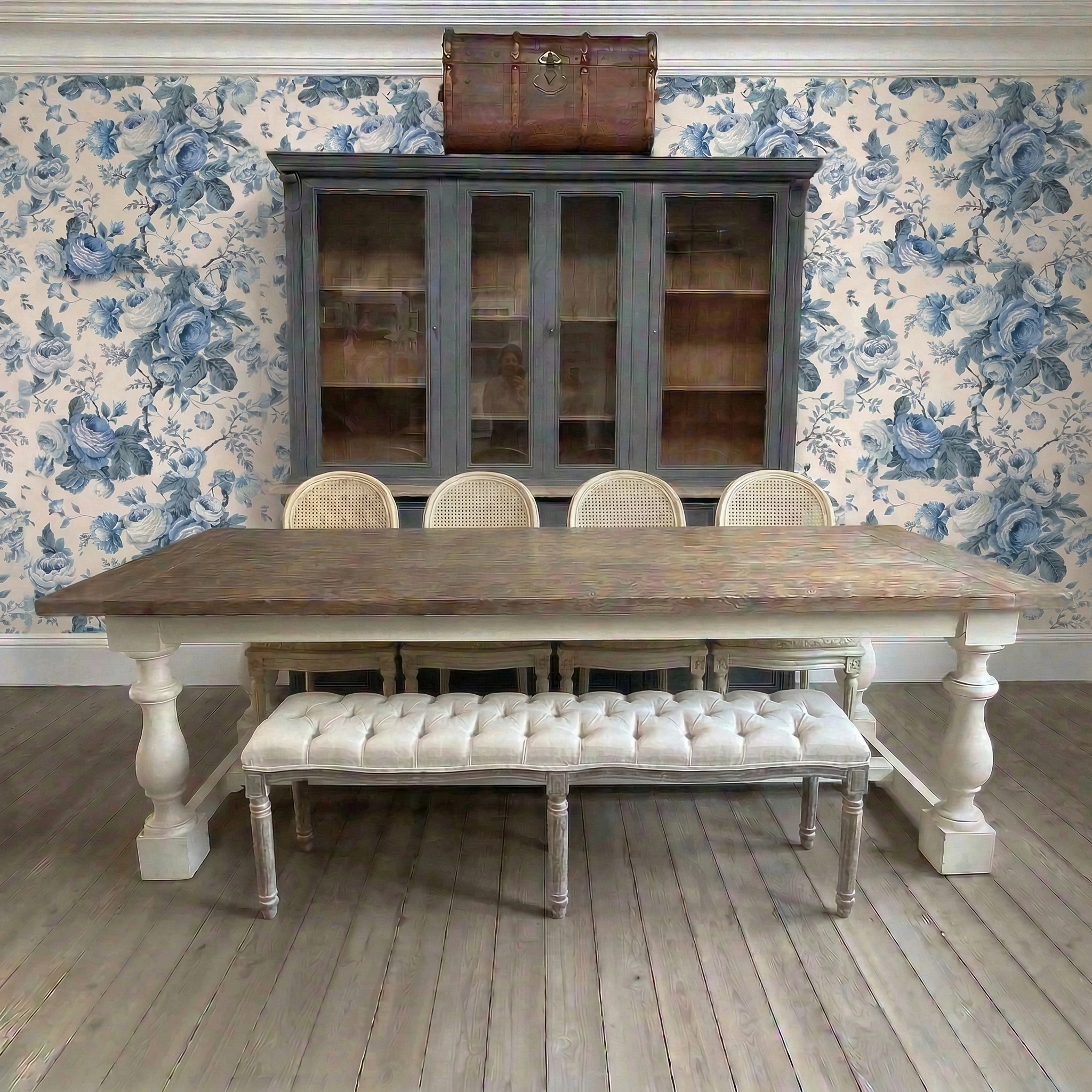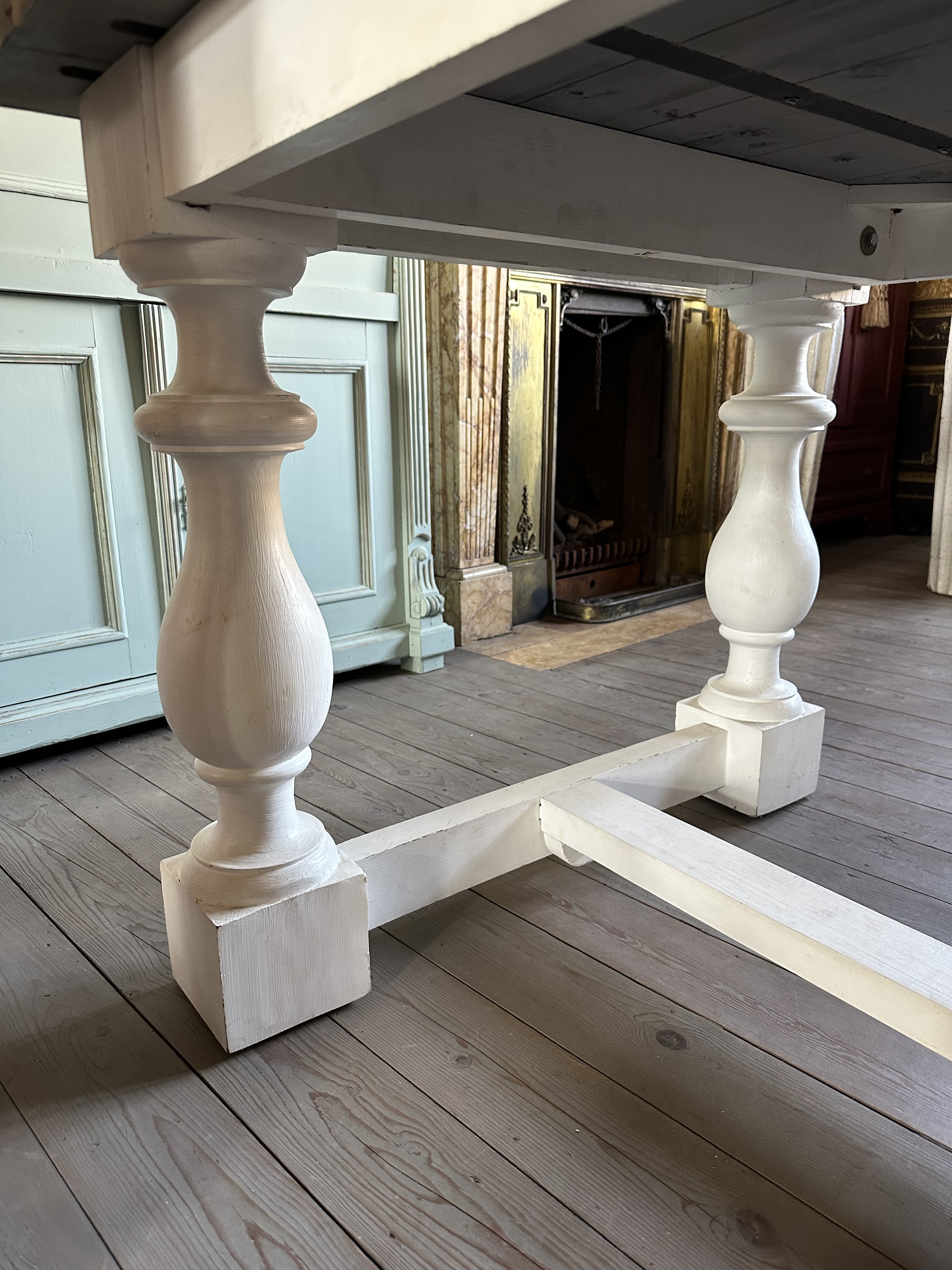 Prachtige landelijke tafel met witte gedraaide poten en paars-bruin tafelblad