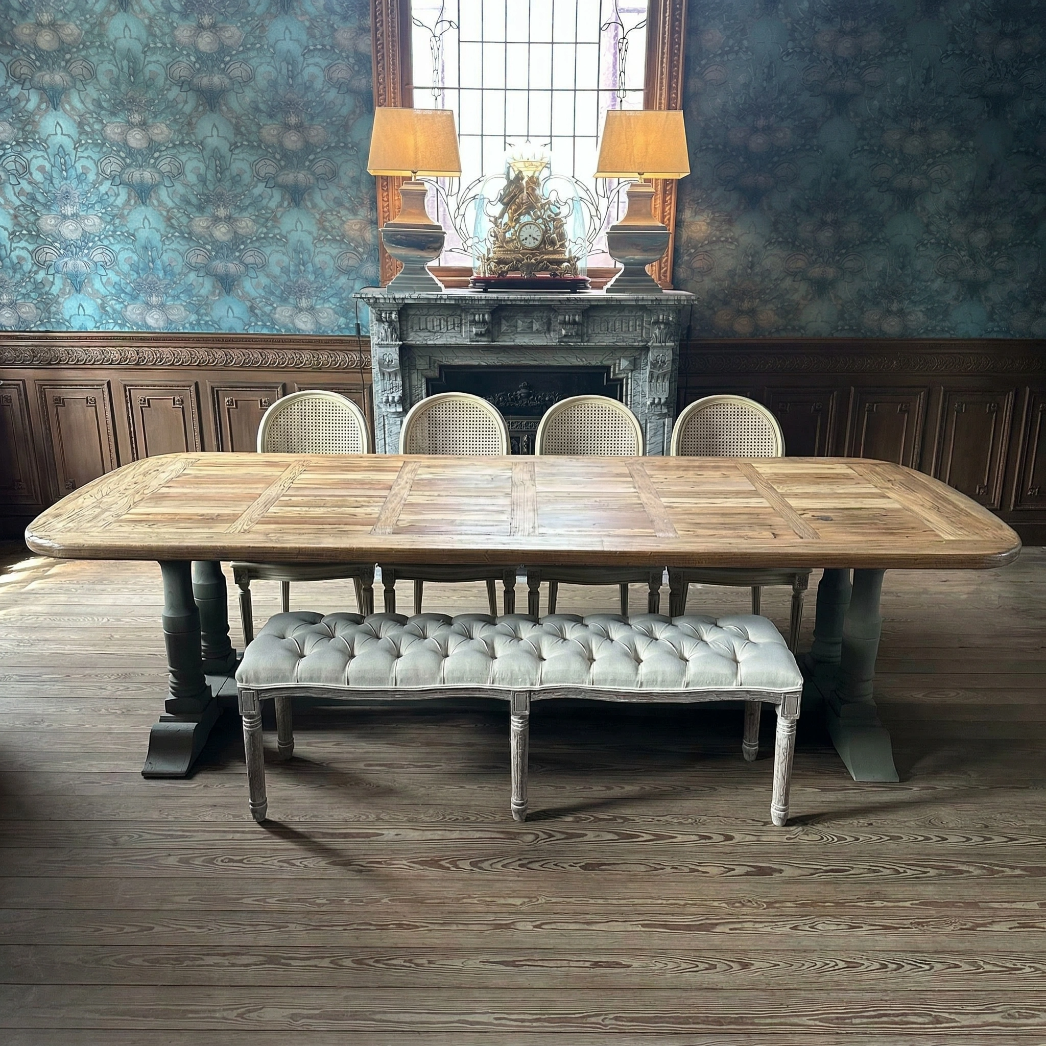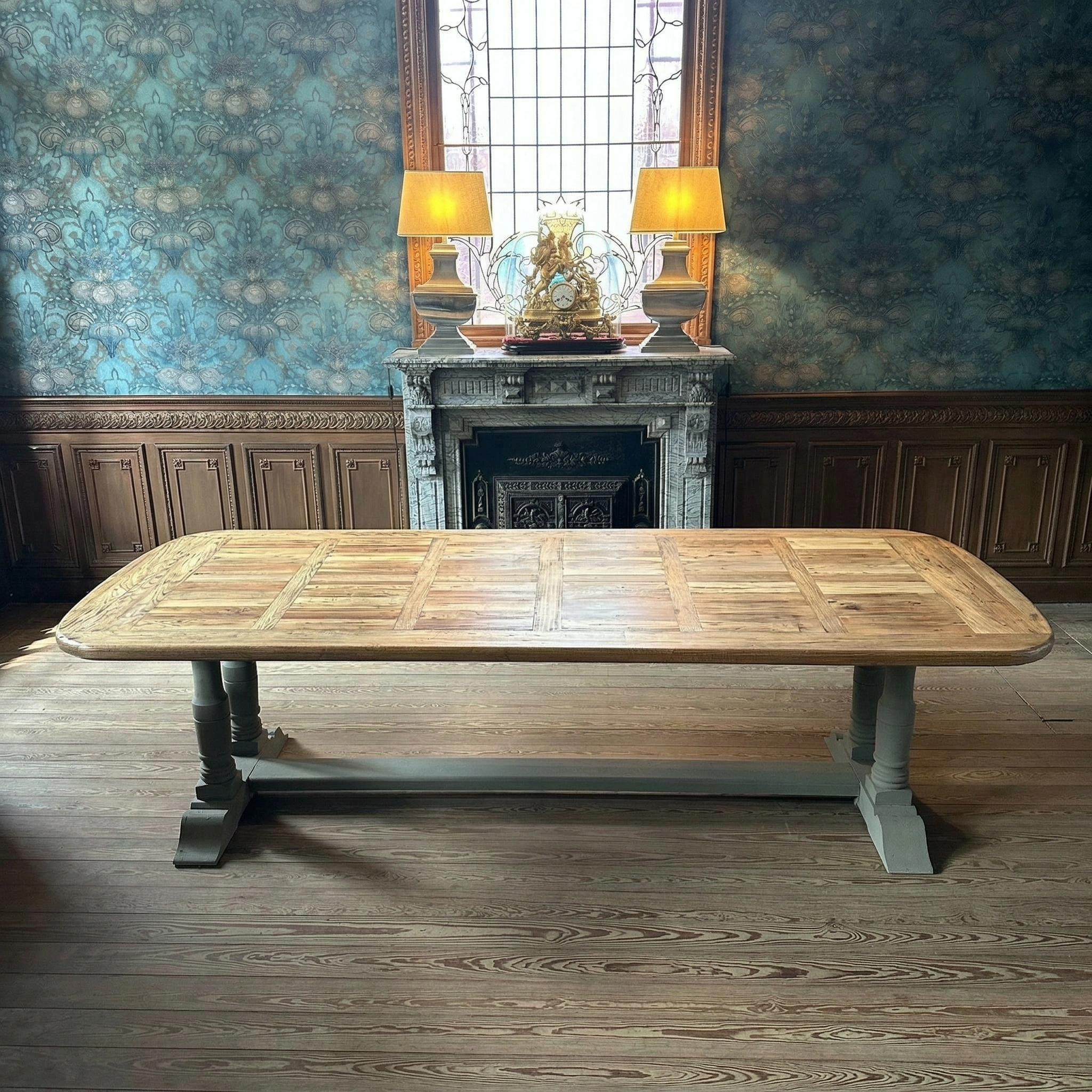 Kloostertafel met gedraaide taupekleurige poten en een prachtig blad
