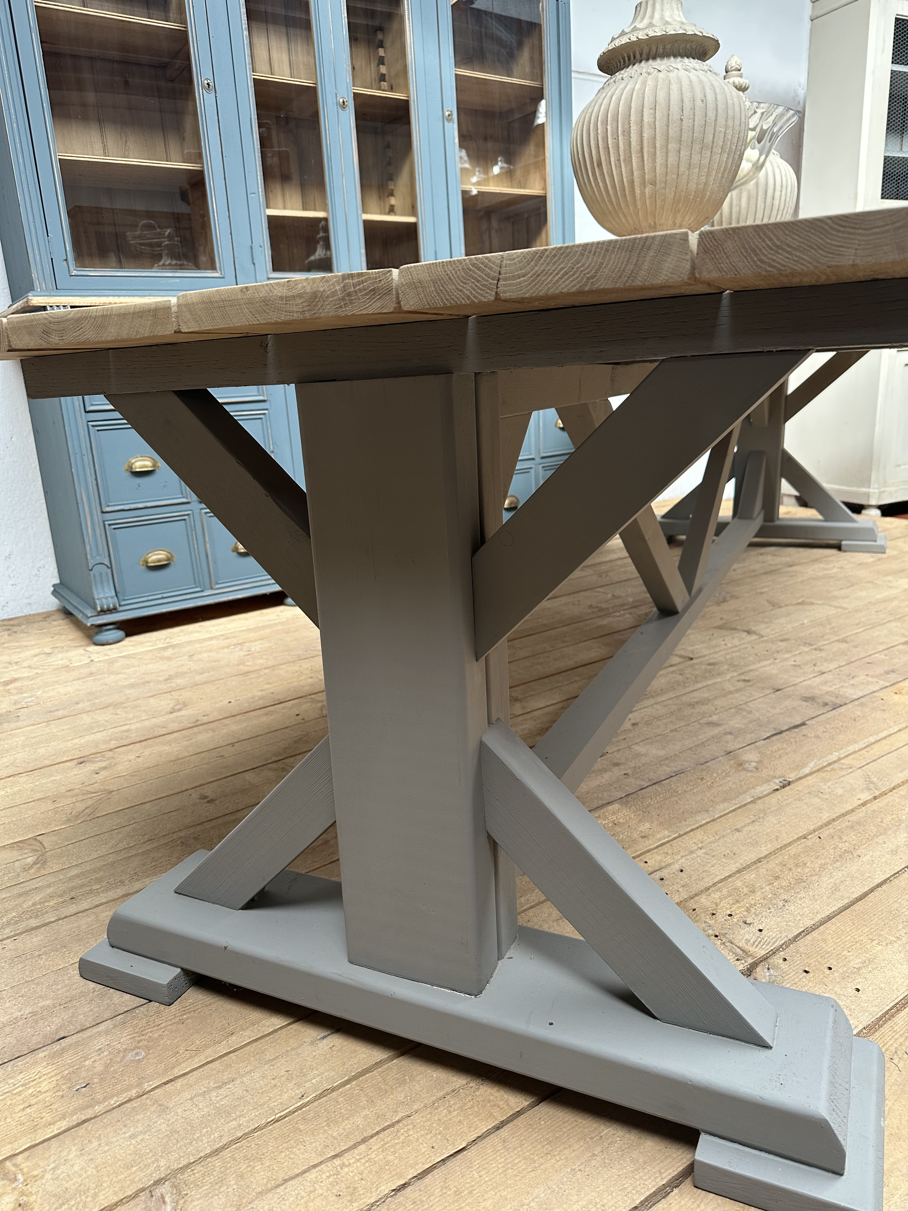 Kruispoottafel taupe kleur met eiken naturelkleurig blad
