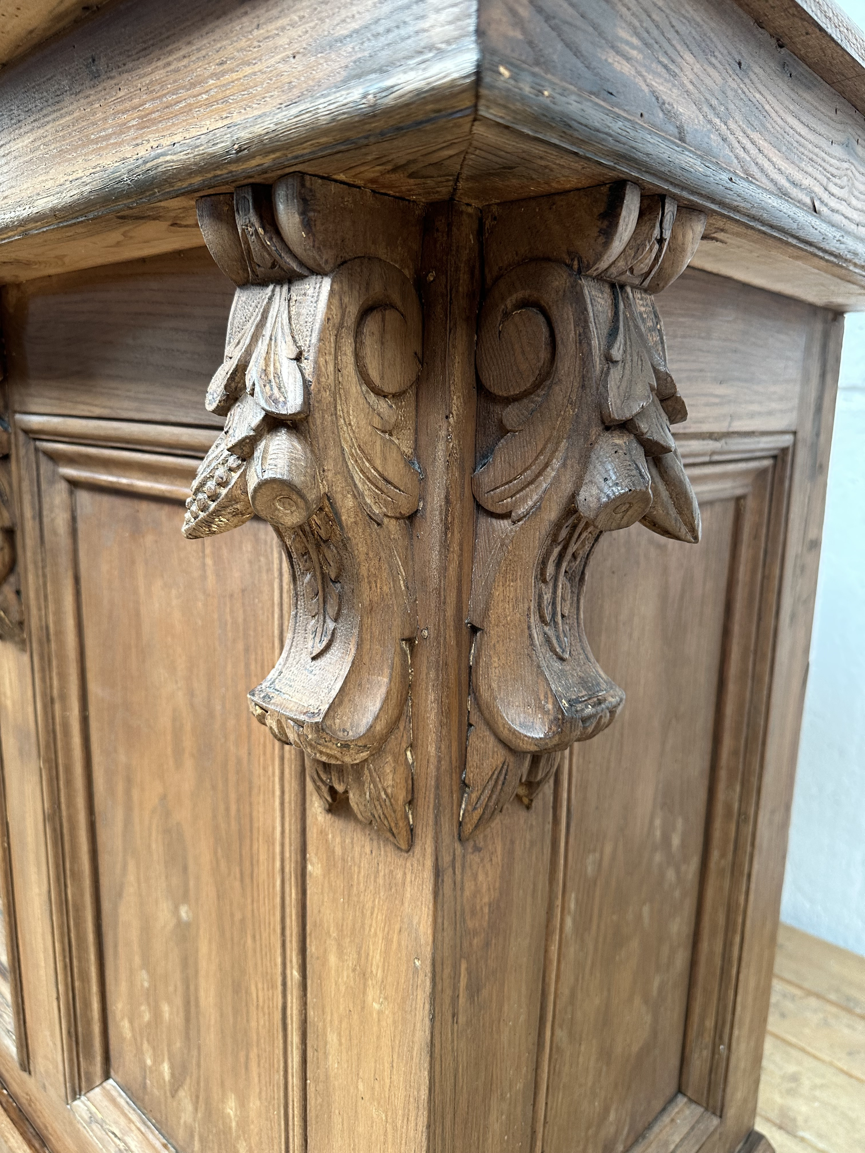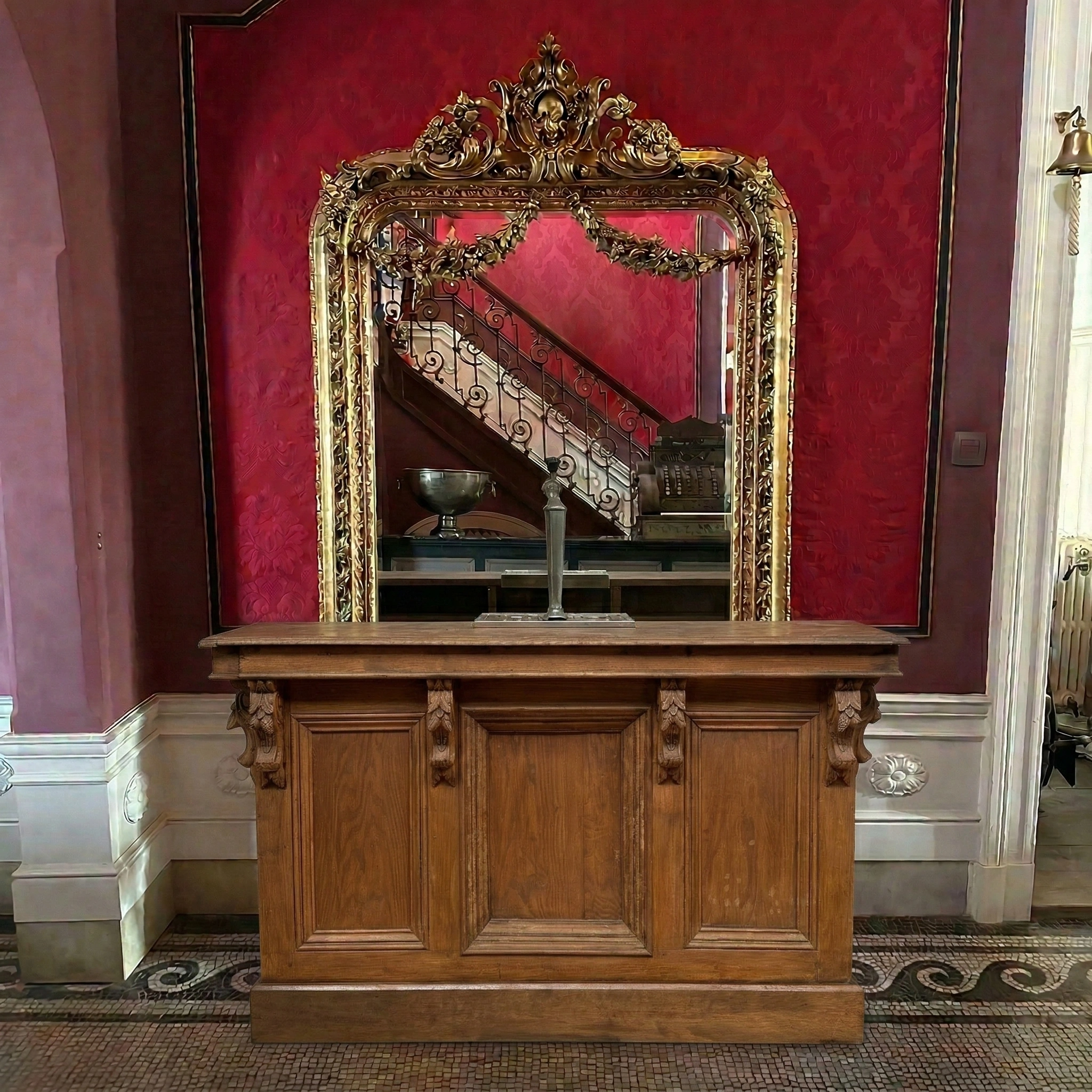 Antieke toog met prachtig sculpteerwerk, inclusief mooie oude tapkraan