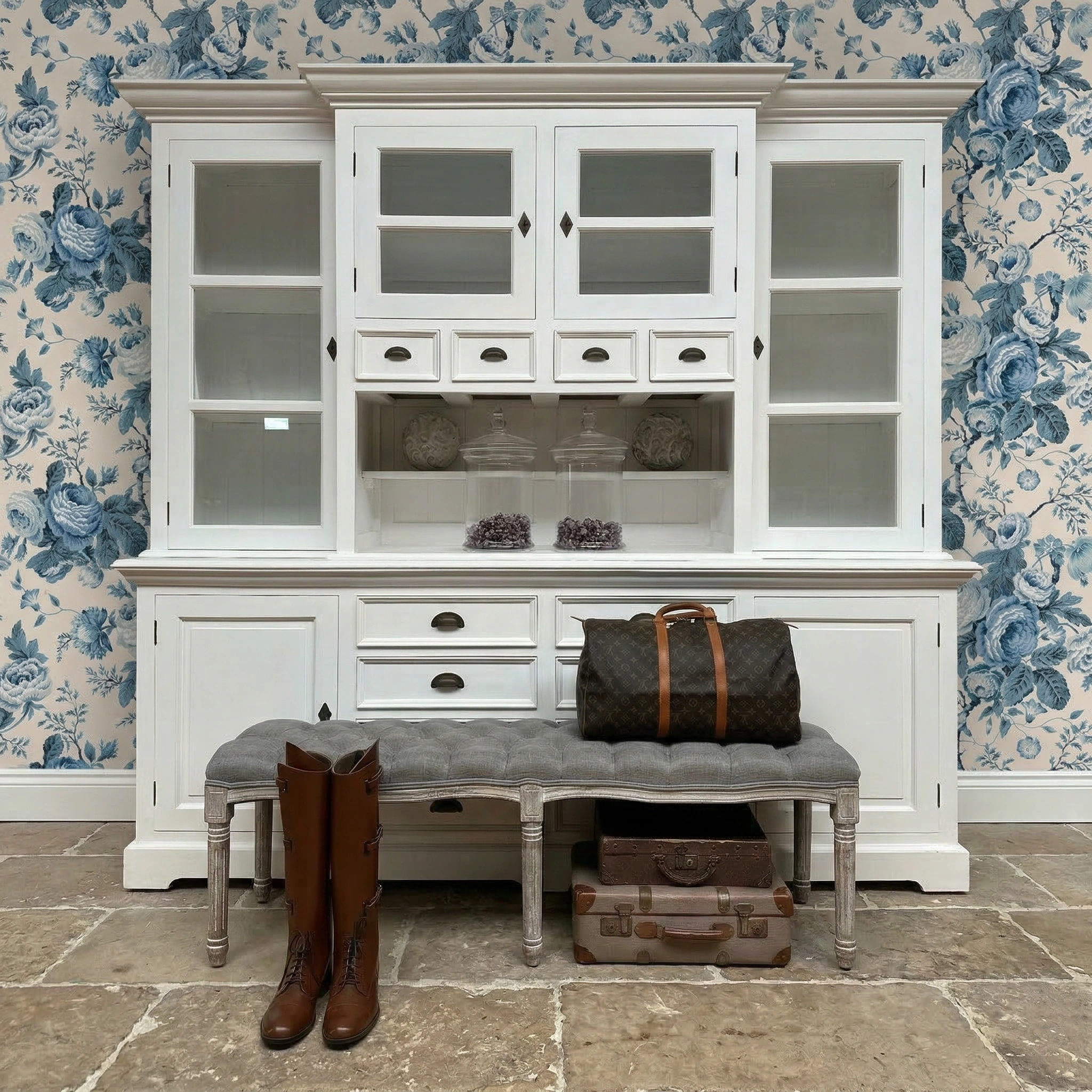 Bankje met violet-taupe kleurige gecapituleerde stoffen bekleding eveneens te koop voor €275