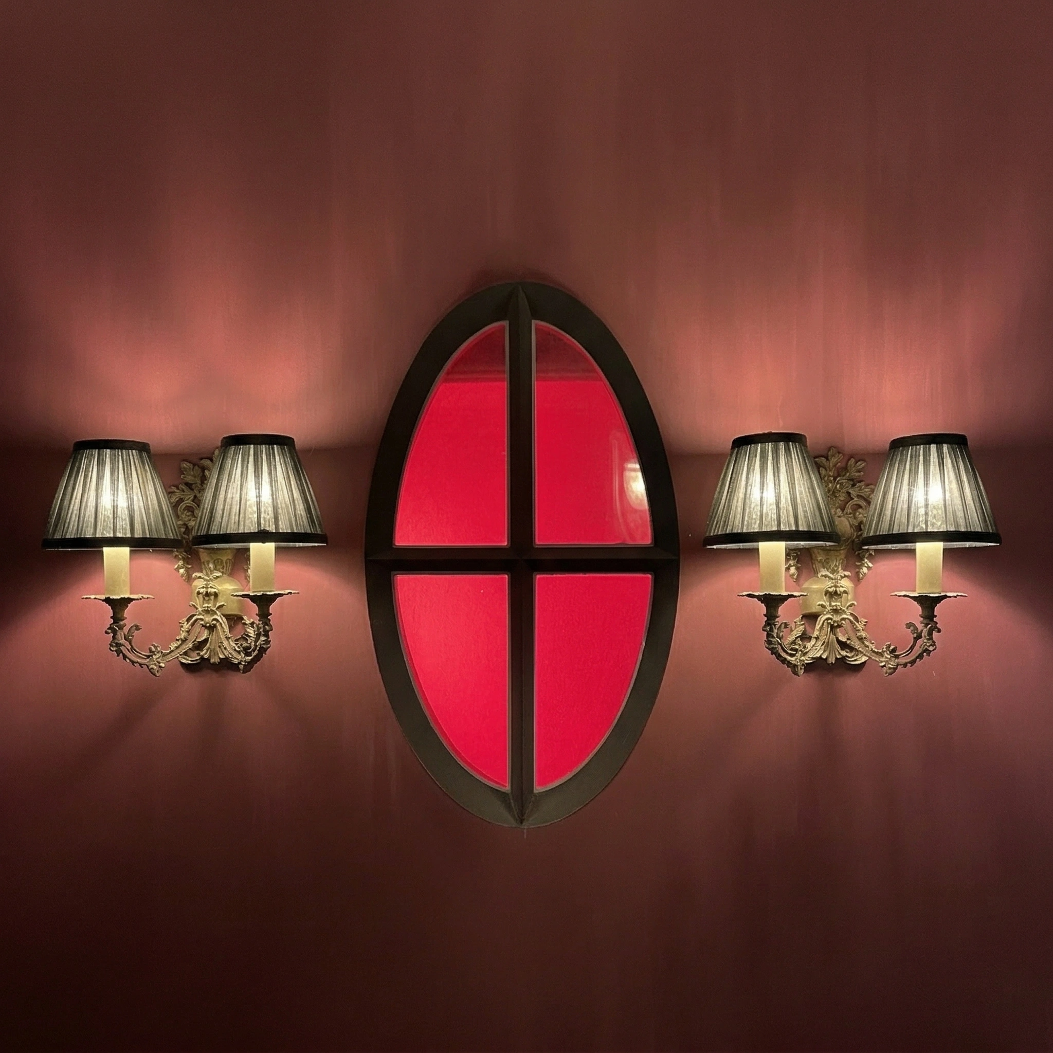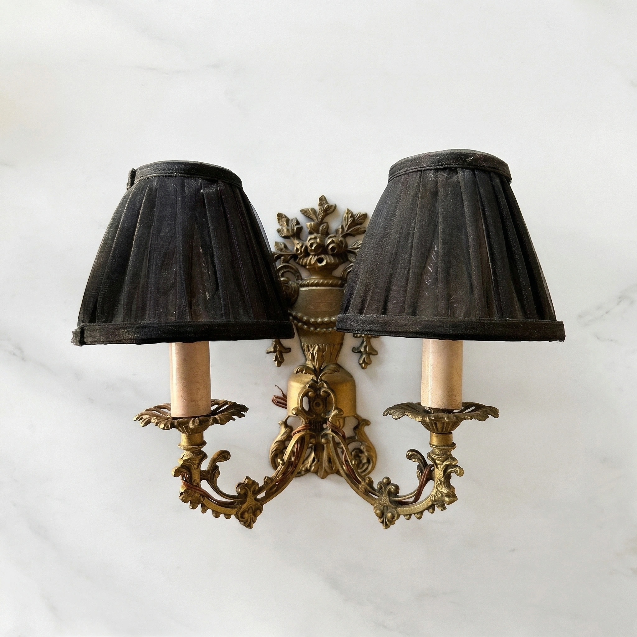 Fraaie set koperen wandlichtjeds met zwarte lampekapjes