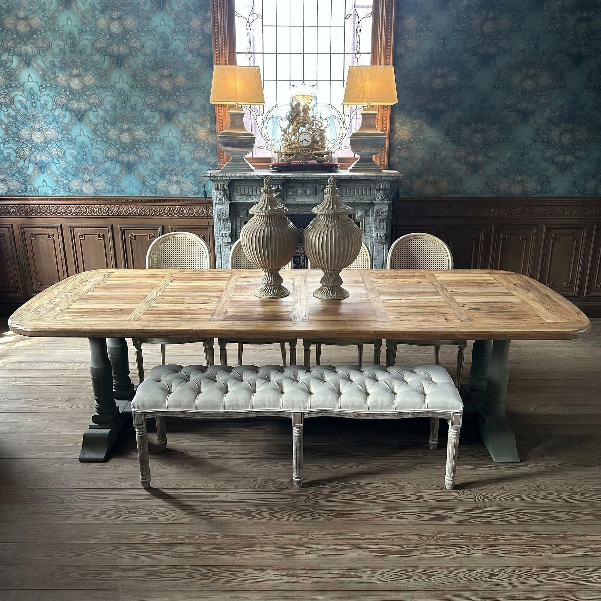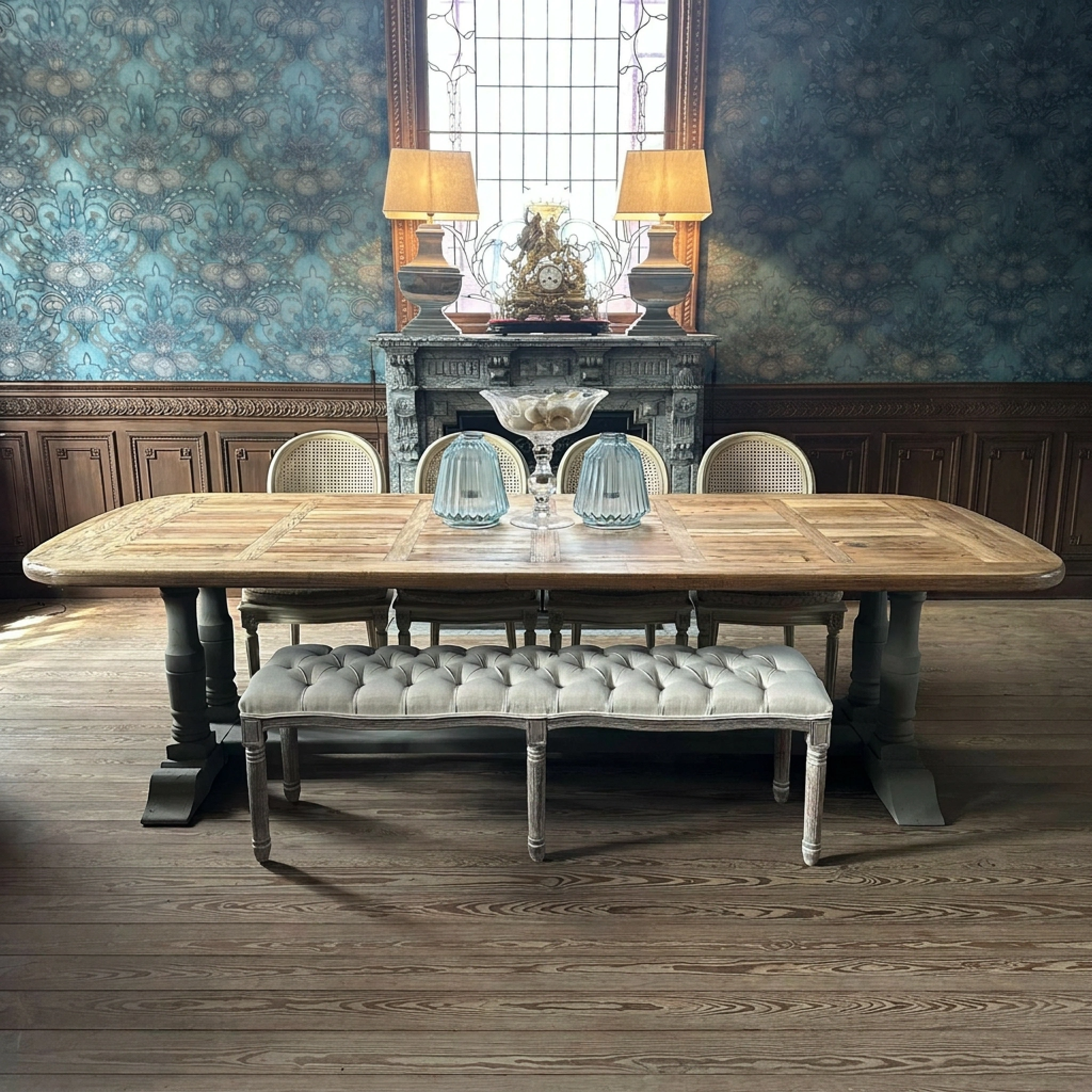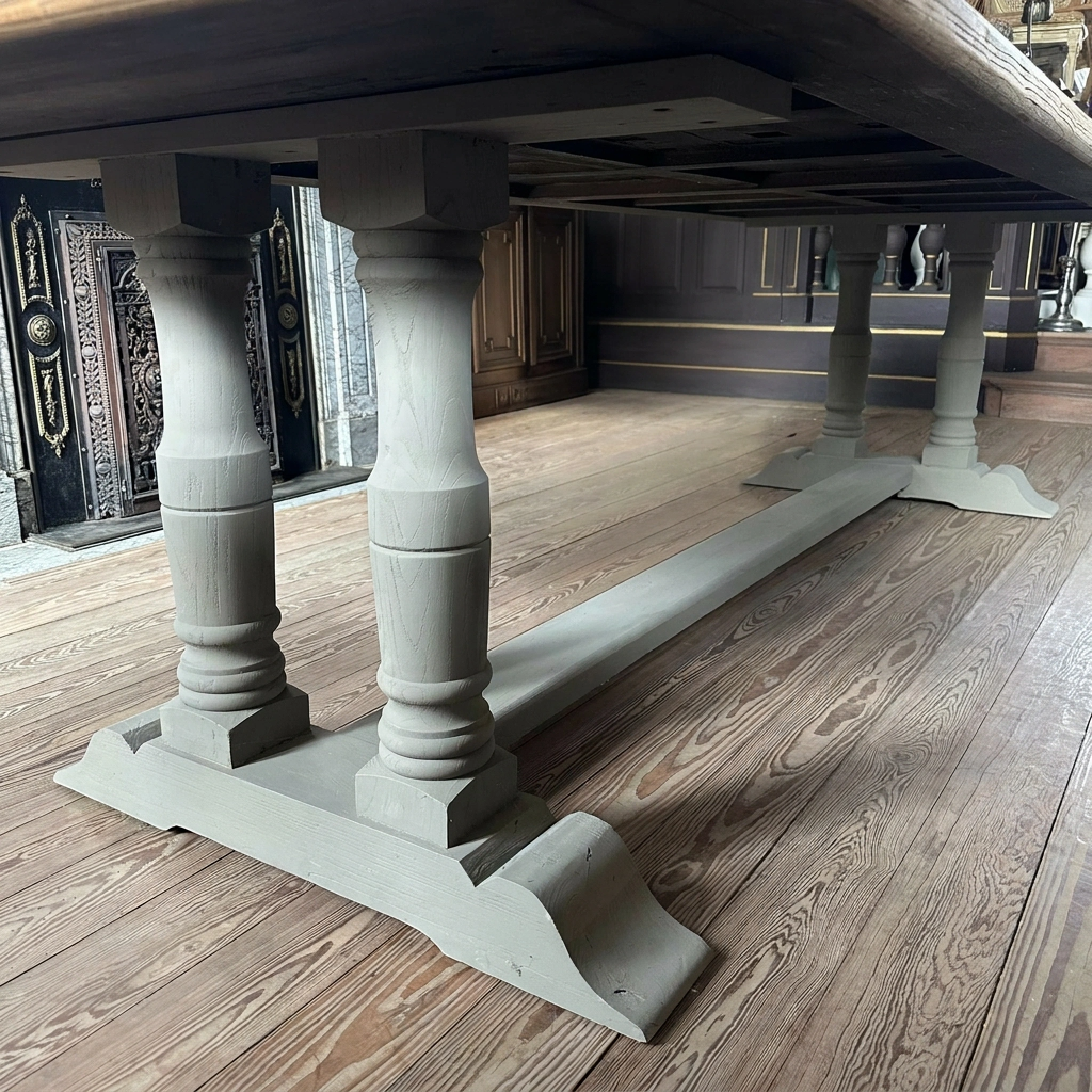 Kloostertafel met gedraaide taupekleurige poten en een prachtig blad
