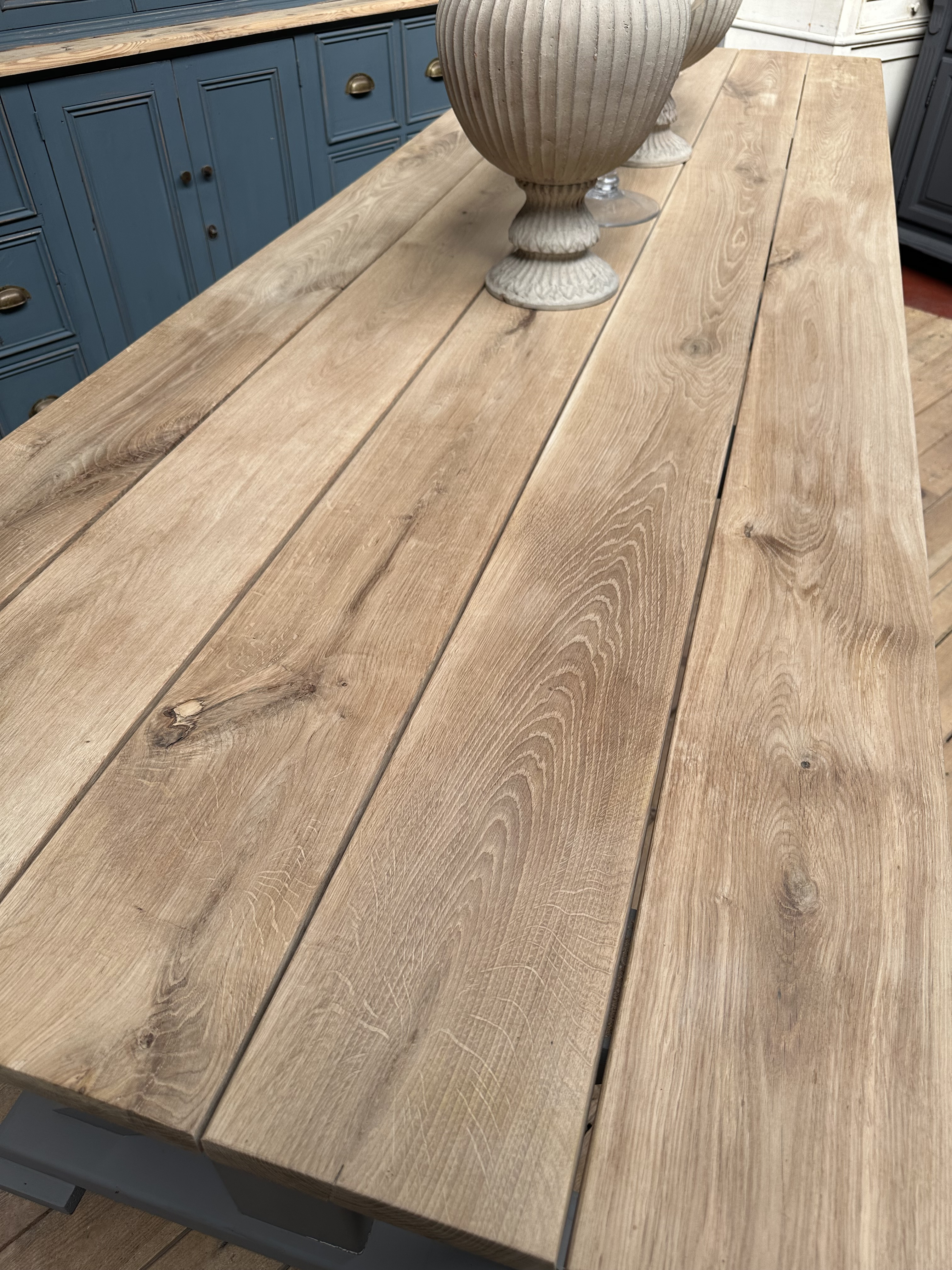 Kruispoottafel taupe kleur met eiken naturelkleurig blad